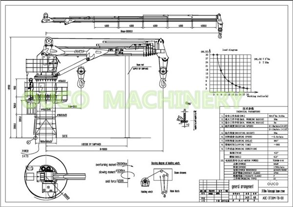 OUCO Marine/Offshore 3T30M Telescopic boom crane is mainly used on the deck of bulk carrier or overload barge for handling a variety of cargo bulks. It has several hoisting points to fit the demand of vessel usage, which are 3T30M, 30T6M, makes the crane with long outreach to complete the lifting job. Service system: Engineers available to service machinery overseas.